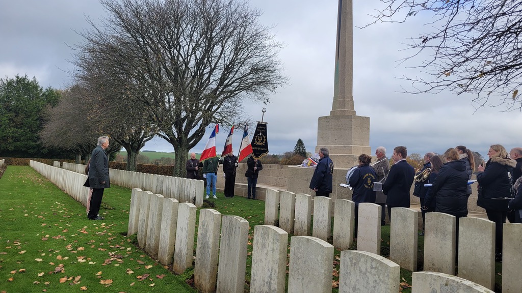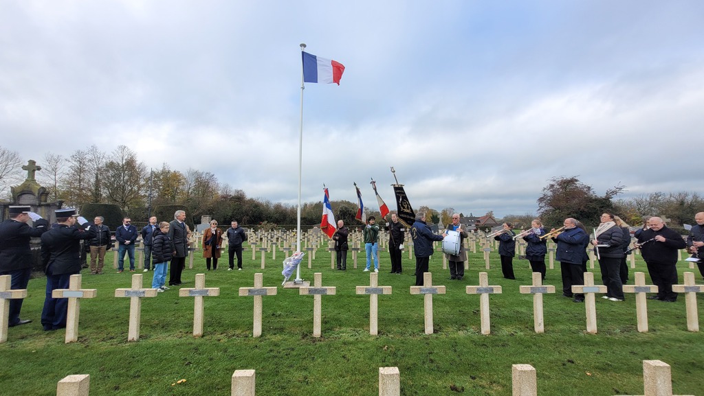La cérémonie a commencé aux Cimetières Britanniques et Français où Monsieur le Maire, Jean-Michel DESAILLY, a effectué un dépôt de gerbes et la levée du drapeau tricolore.